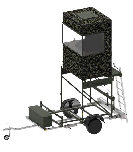 Die Kabine ist mit Druckstoßdämpfern versehen, sodass die Kabine ohne großen Kraftaufwand ein- und ausgeklappt werden kann. Der Unterbau der fahrbaren Jagdkanzel ist ein vollwertiger Autoanhänger und besteht aus einem feuerverzinkten Stahlrohrrahmen.
